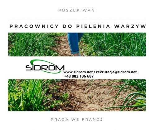Sezonowa praca we Francji 2021 w rolnictwie (okolice Amiens) przy usuwaniu chwastów z upraw warzyw. Pielenie wymaga dokładności oraz delikatności, aby razem z chwastami nie usunąć warzyw. Walkę z chwastami rozpoczyna się w maju i kończy z początkiem lipca.