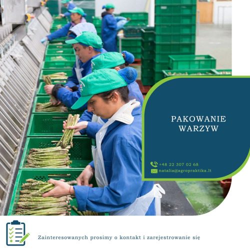 Zakres obowiązków: Praca w pakowalni na linii, pakowania szparagów, szpinaku, ziół, sałat. Należy być przygotowanym do pracy w chłodnym środowisku. Praca wiąże się z podnoszeniem skrzynek z produkcją.
