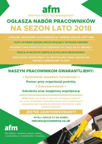 Brytyjska firma Ametros Facilities Management ogłasza nabór pracowników sezonowych na lato 2018. Oferta skierowana jest do wytrwałych osób, które mają jasno określone cele finansowe oraz gotowe są podjąć się ciężkiej pracy fizycznej na terenie Wielkiej Brytanii. Główny zakres działania AFM to sprzątanie studenckich obiektów mieszkalnych.